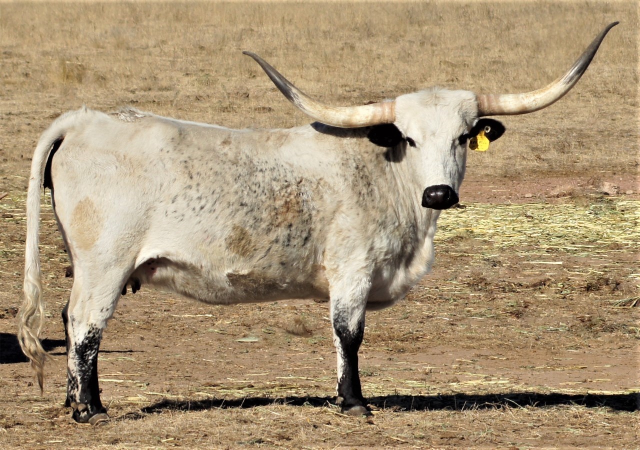 She is a CONCEALED WEAPON daughter that is very friendly and loves cake out of your hand. Although she is not colorful herself, she has given us unusually colorful offspring. Her daughter WINNIE THE MOO is mostly black and passes it on. Her last bull calf was sold as a bull because of his beautiful color conformation, size and horn. She always out produces herself as calves are always a step up from mom.