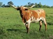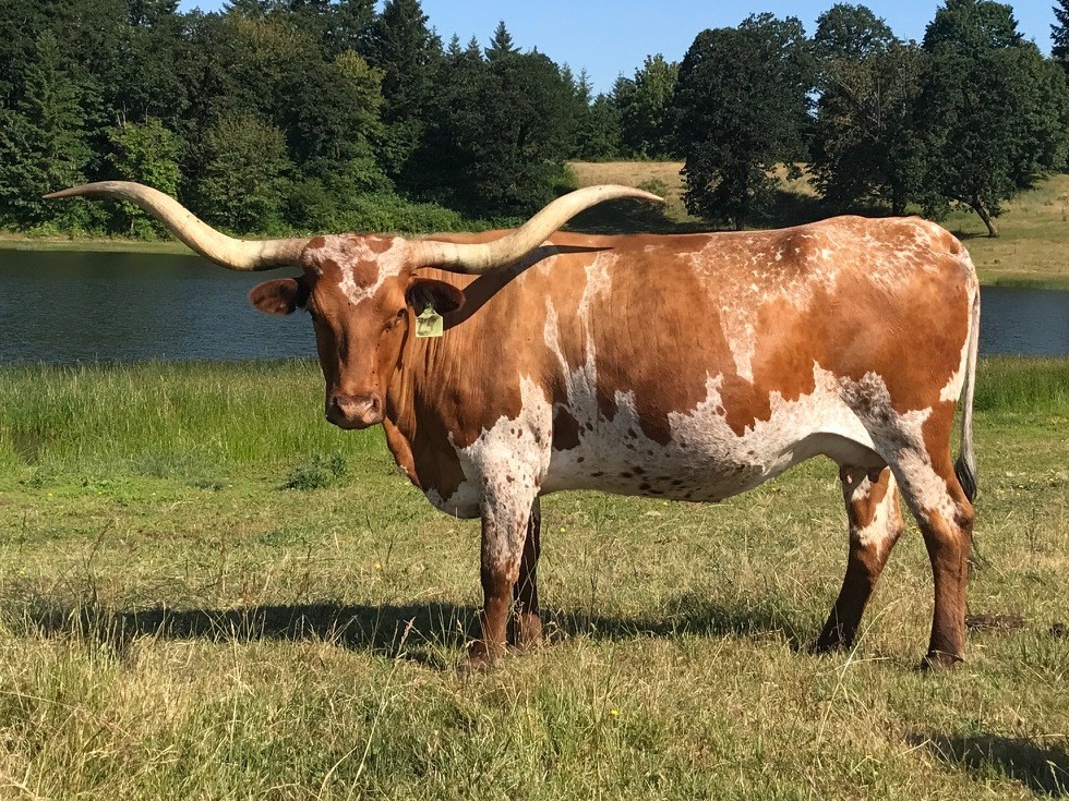 Bowman breeding, beautiful set of twisty horns, superb milker and great conformation. Look at her 2018 heifer - Atlas' Gretel - and her 2019 bull - Tuff Vortex. Her 2020 bull by CR Divico was sold as a herd sire prospect. Very happy about her 2021 heifer by Tuff and Grande 2/15 - Tuff Deana is a full sister to Vortex. Has another heifer by Tuff and Grande 2/15 in 2022. Bull calf by Tuff and Grande in 2023. Gorgeous red and white paint heifer by HL Range Finder in 2024.