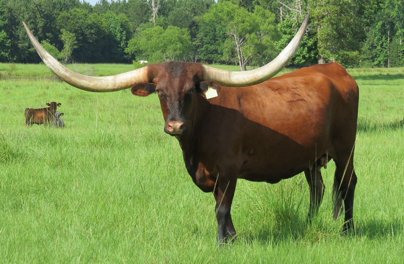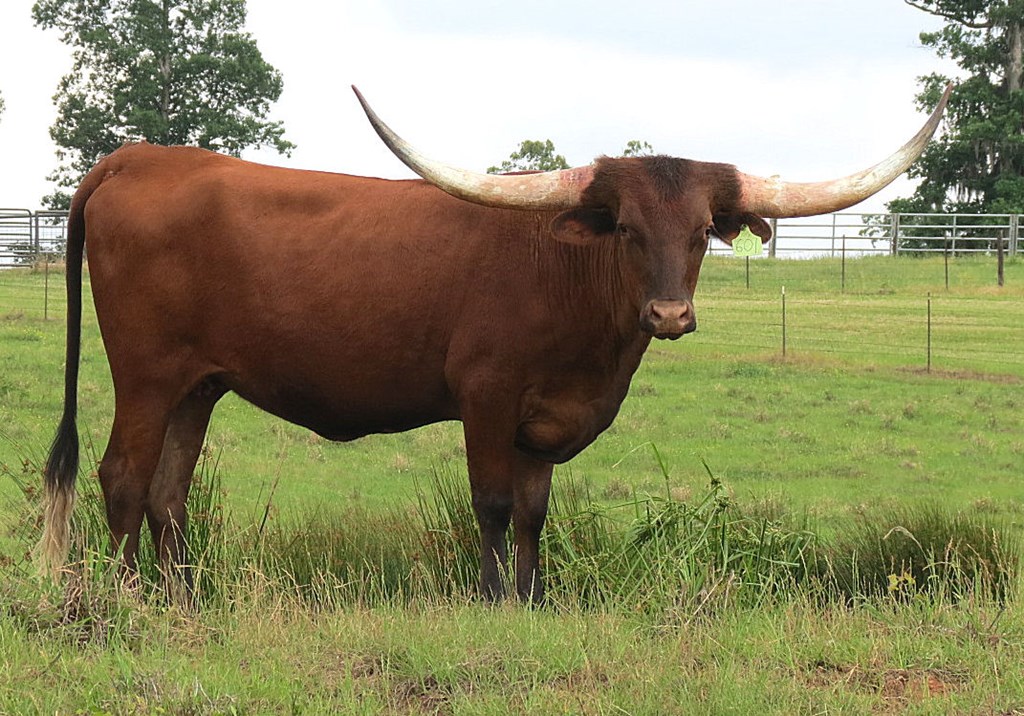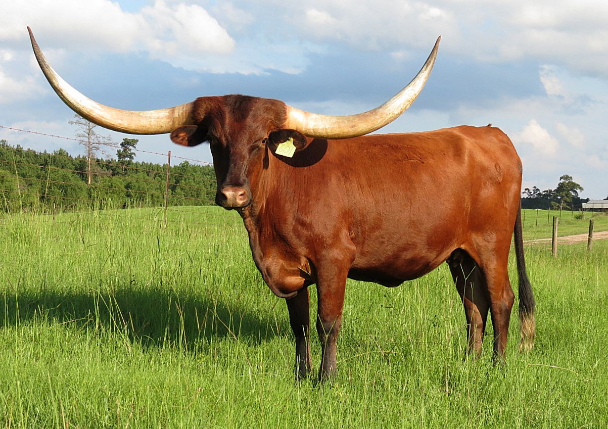 Ring Adelita is a beautiful deep red and those horns make her stand out in the pasture. She’ll stop more traffic than a dead man as Colonel Eddie Wood would say. She raises a good calf each year. She has 79” ttt and over 105” total horn. Ringman offspring have sold for more than $340,000