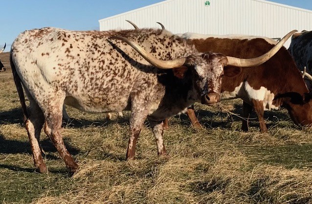 Daughter of Jubal Jangler, the oldest son of the Legendary 2010 Ultimate Cow, Shadow Jubilee, and our herd matriarch Whistlin Diamond, MCR E BURR ANN is a cow that truly has it all. She’s flashy with 80+inches of stunning twisty horns. She carries a large frame, and has car-stopping color that makes her impossible to miss. Beyond her striking looks, she’s friendly and easy to handle, happy to eat out of your hand, and a joy to have in our herd. MCR E BURR ANN raises thick, big bodied calves and has been honored with the prestigious Dam of Merit Award, proving her value both on paper and in practice. With pedigree, performance, temperament, and style, she’s a cornerstone and favorite in our herd